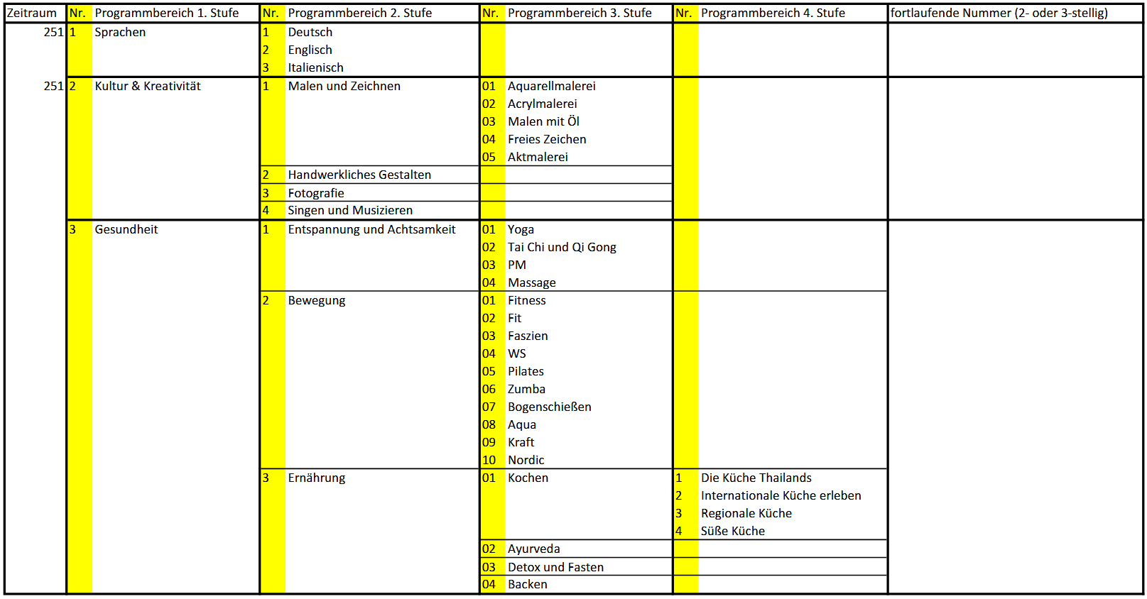 Wie viele Programmbereiche benötige ich und wie sollen die Kursnummern aufgebaut sein?