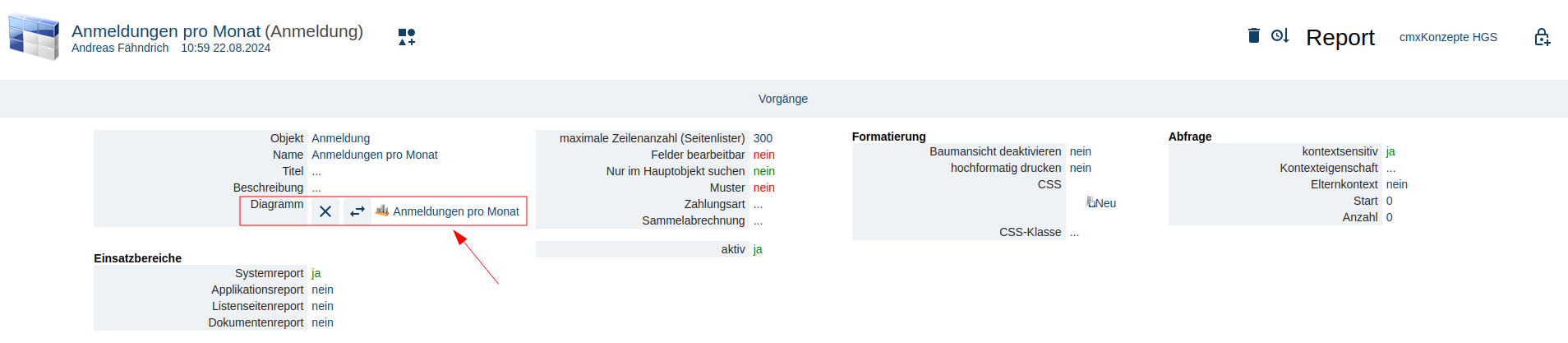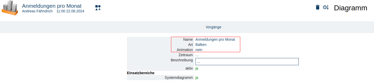 Nachdem wir diesen geöffnet haben, sehen wir das im oberen Bereich beim Attribut "Diagramm" eine Diagramm mit dem Namen "Anmeldungen pro Monat" verknüpft ist: