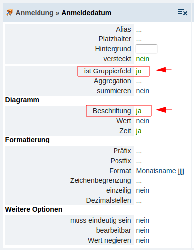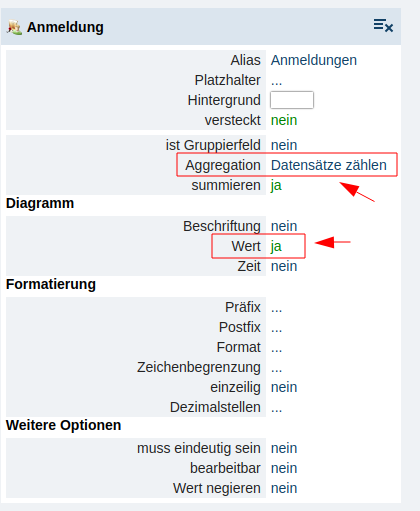 Hinweis: Entspricht die Spalte, wo dieses Abtritt auf "ja" gesetzt wird keinen richtigen auswertbaren Wert, muss zusätzlich beim Attribut "Aggregation" in der Spalte eine entsprechende Auswahl hinterlegt werden. Am häufigsten wird die Auswahl "Datensätze zählen" oder "Summe" genutzt. Die Aggregation "Datensätze zählen" bezieht sich auf das Objekt (z.B. wie viele Anmeldungen es sind). Die Aggregation "Summe" bezieht sich auf Beträge und bildet die Summe daraus (z.B. der Gesamtbetrag pro Anmeldung einer Veranstaltung summiert).