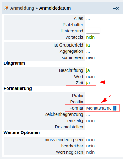 In der selben Spalte "Anmeldedatum" ist über das Attribute "Zeit" und das Attribut "Format" definiert, woher die Zeit kommt und welches Darstellungsformat diese hat.